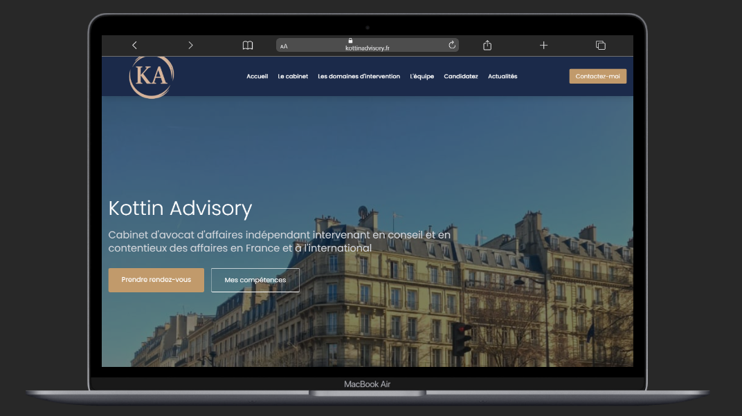 Ci joint le site vitrine de Kottin Advisory, cabinet d’avocats d’affaires indépendant intervenant en conseil et en contentieux, en France et à l’international. Réalisé avec React.js, le site valorise l’expertise du cabinet et accueille chaque mois des milliers de visiteurs. Grâce à une approche soignée du design et du contenu, le site a été validé d’un coup par l’Ordre des Avocats de Paris, garantissant conformité et crédibilité. Ce projet illustre ma capacité à créer des sites professionnels performants, sécurisés et orientés résultat, combinant impact visuel, expérience utilisateur et respect des standards métier.