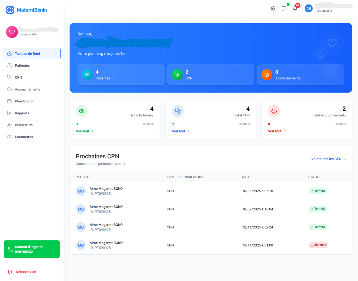 MaterniBénin est une application web conçue pour digitaliser la gestion des dossiers de maternité dans les centres de santé au Bénin. Elle permet aux sages-femmes de gérer les patientes, les consultations prénatales, la planification familiale et les accouchements, avec génération automatique des rapports mensuels. En remplaçant les registres papier, la plateforme réduit les pertes d’informations, les erreurs et la charge administrative. Basée sur une architecture web centralisée multi-centres, MaterniBénin garantit la sécurité et l’isolation des données de chaque centre. L’application est développée avec Next.js pour le frontend et Firebase (BaaS) pour le backend, avec cron-job.org pour l’automatisation des rapports et Twilio pour les notifications SMS. Accessible via un simple navigateur, elle contribue à améliorer le suivi des femmes enceintes et la modernisation de la santé maternelle au Bénin.