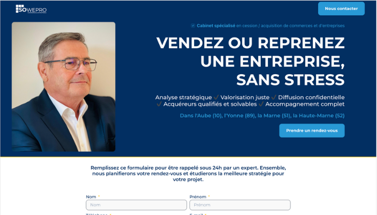 Le site sowepro-transactions.fr est une plateforme moderne et intuitive dédiée à la mise en relation entre vendeurs et acquéreurs de commerces et entreprises. Conçu pour convertir, il propose une navigation claire, des annonces structurées, des filtres efficaces et des appels à l’action visibles. Chaque page met en avant la valeur des opportunités avec des visuels soignés, des informations clés et un parcours utilisateur fluide. Optimisé pour le SEO et le mobile, le site facilite la recherche, la prise de contact et augmente la visibilité des biens mis en vente, offrant une expérience simple, efficace et orientée résultats.